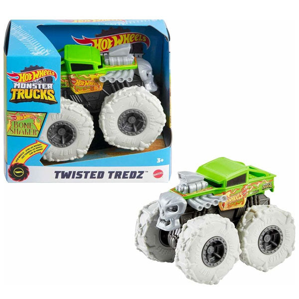Crush the competition with monsterized, motorized Hot Wheels Monster Trucks Twisted Tredz vehicles. The 1:43 scale toy trucks feature creature-themed bodies on chassis raised with giant wheels and automated motion. Pull each monster truck back and release -- the friction motor sends the ferocious vehicles rolling over obstacles and terrain with ground-pounding forward motion!